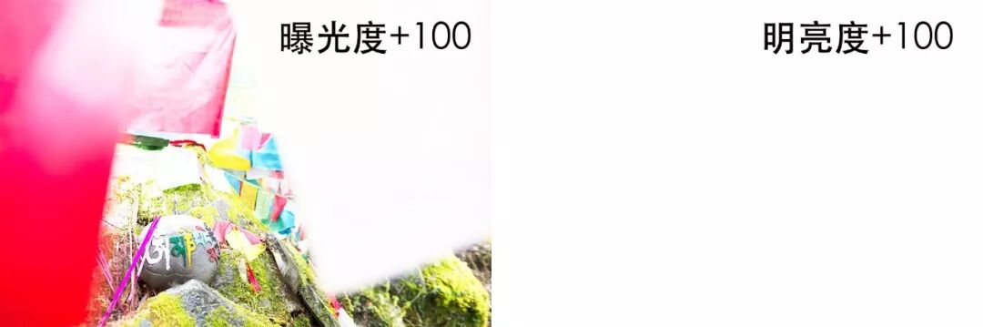 很多人不太明白“明亮度”和“曝光”的区别,这两者很相似,在绝大多数操作中(除了个别特殊设置)其区别是:明亮度是线性提升亮度,而曝光则是非线性的,对于纯色、暗部和亮部都有保护。所以曝光度提升到100画面也不会纯白,而“明亮度”则是把画面完全变白。